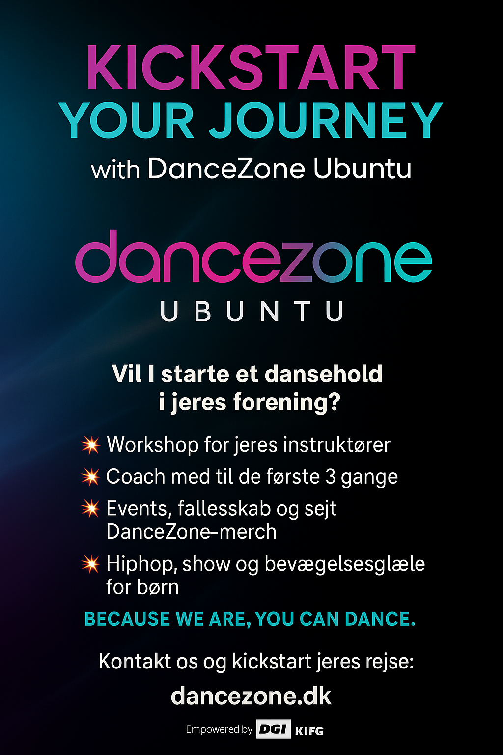 DanceZone Ubuntu er et dansefællesskab i børnehøjde – skabt for at få endnu flere børn og unge ind i glæden ved dans og foreningsliv. Vi tror på, at alle drømme begynder med ét skridt. Og det første skridt tager vi sammen.